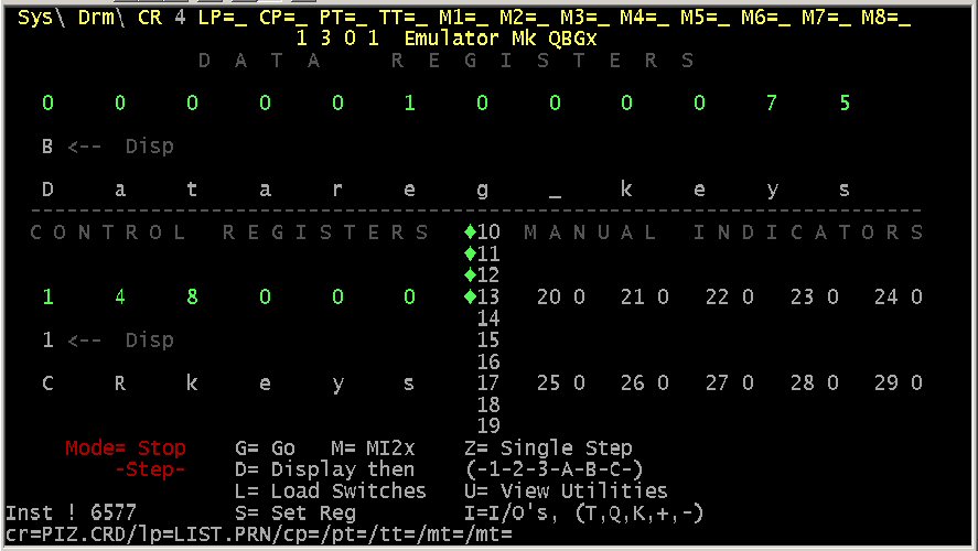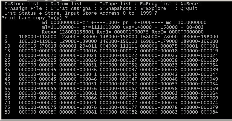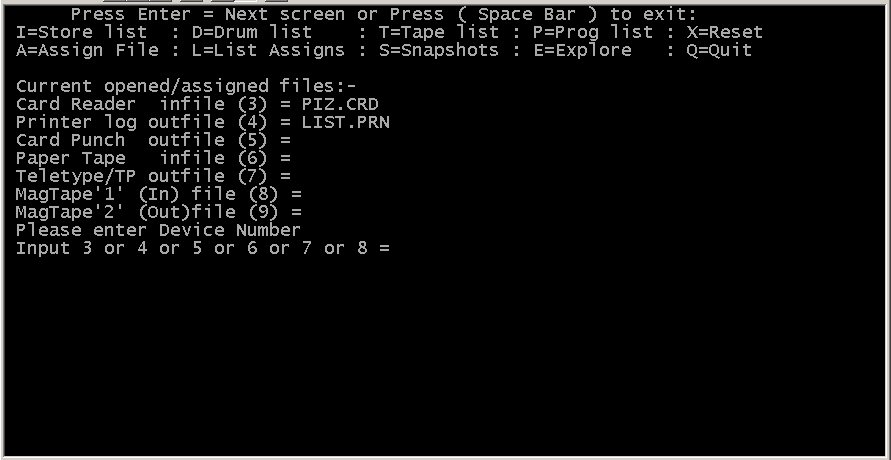 it takes to run the final emulation.Some screen shots from the oldest emulator are below. These we hope to update this year. This emulator was started so long ago that the first version was just 100 twelve digit 1301 words and a small subset of the order code. It ran on a hand built Nascom 2 in just 32k of Ram. But it did work and ran 1301 machine code, so it has remained a project of mine for a long while. Far too long actualy, and starting the project to recover the software from Flossie gave me new interest in this. The emulator runs the Initial Orders we have recovered from the DRUM. It supports Card Input and Line printer Output files, Paper Tape input and output, and Mag Tape Input and Output ( only one of each at present ). Allows access to store ( IAS ) images and Drum Images and supports up to 2 whole Drums. It also crashes if you do anything stupid ( As it lacks MUG TRAPPING ) and its not the slickest of interfaces. Sterling multiply is also very, very Buggy and yes it is VERY SLOW at about 20 percent of the actual 1301 speed. ![]() The User Interface showing the main Data Register display the Control Registers, the Programmed and Manual indicators. Where the opperator push buttons would be are a Status display and a prompt to the user as to the key presses required to run the emulator:- G = Go, H = Halt, etc ![]() The file assignment and Interface screen showing the Card reader has a file called PIZ.CRD assigned and the LP output is to a file called LIST.PRN ![]() The Store ( IAS ) list utility in action, the simple programme shown was the first program to run on the emulator, if you want to try to work out what it does ( not a lot actually ) its a good test for the old Grey cells after so many, many years ! It is also my standard speed test for the emulators written ( and not completed ) to date. Access to the Emulator's.